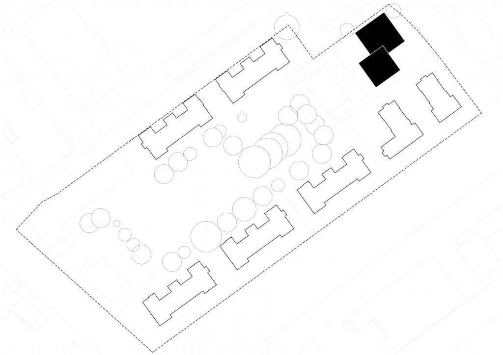Der Neubau nimmt Bezug auf das zerstörte historische Eingangsgebäude und markiert das „Quartiers-Entree“. Städtebaulich reagiert der Neubau auf die Kreuzung Elässerstrasse und Heidenhofstrasse und bildet einen neuen räumlichen Bezugspunkt. Die Gebäudegliederung des Neubaus in einen höheren und einen niedrigeren Baukörper sowie der zur Straße versetzte Gebäudeteil betonen die Sonderstellung und nehmen Bezug auf den Straßenverlauf. Durch die Ausformung des Neubaus entsteht eine betonte öffentliche Einganssituation, das „Quartiers-Entree“ ins historische Kasernenareal, und stärkt dessen Erkennbarkeit.