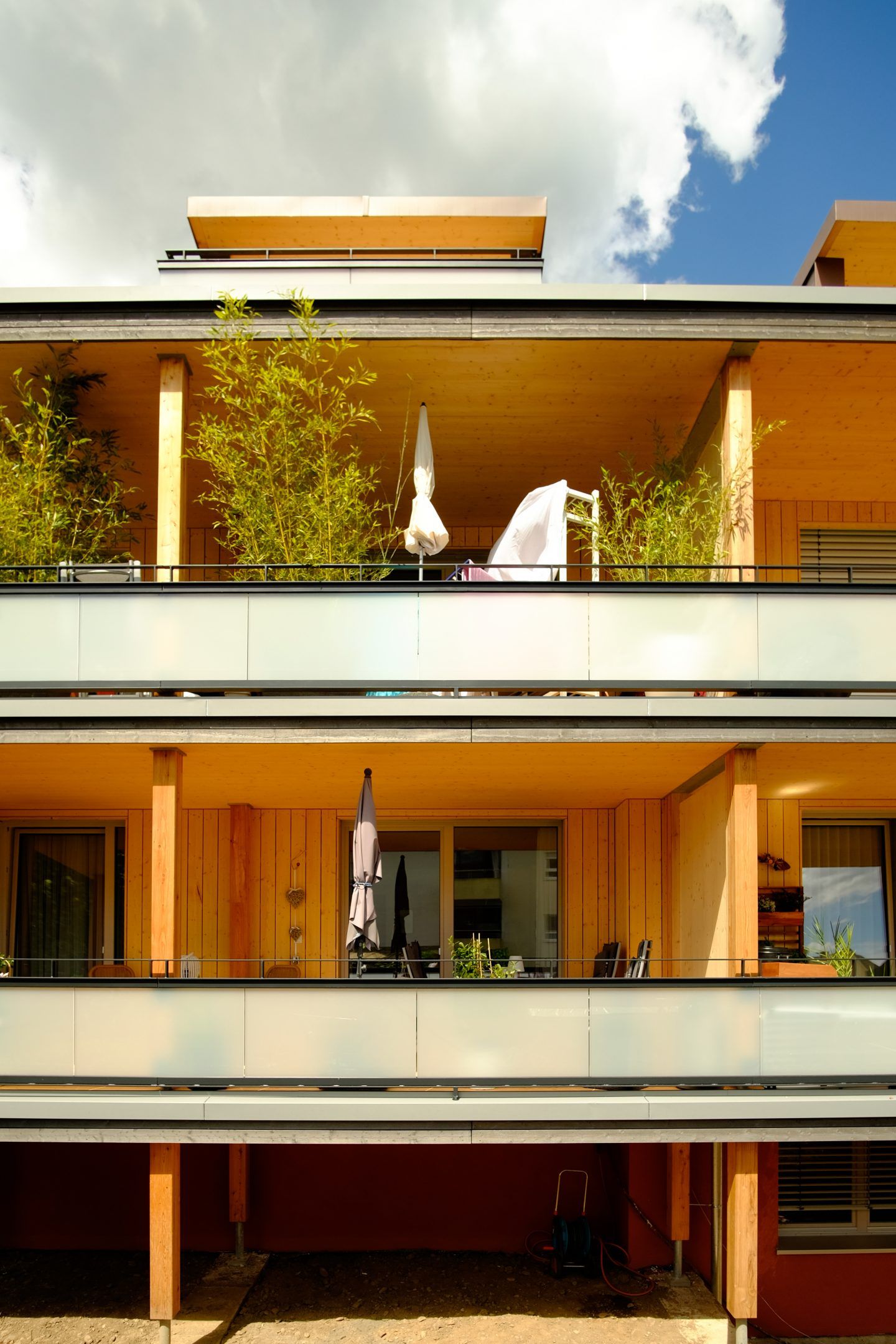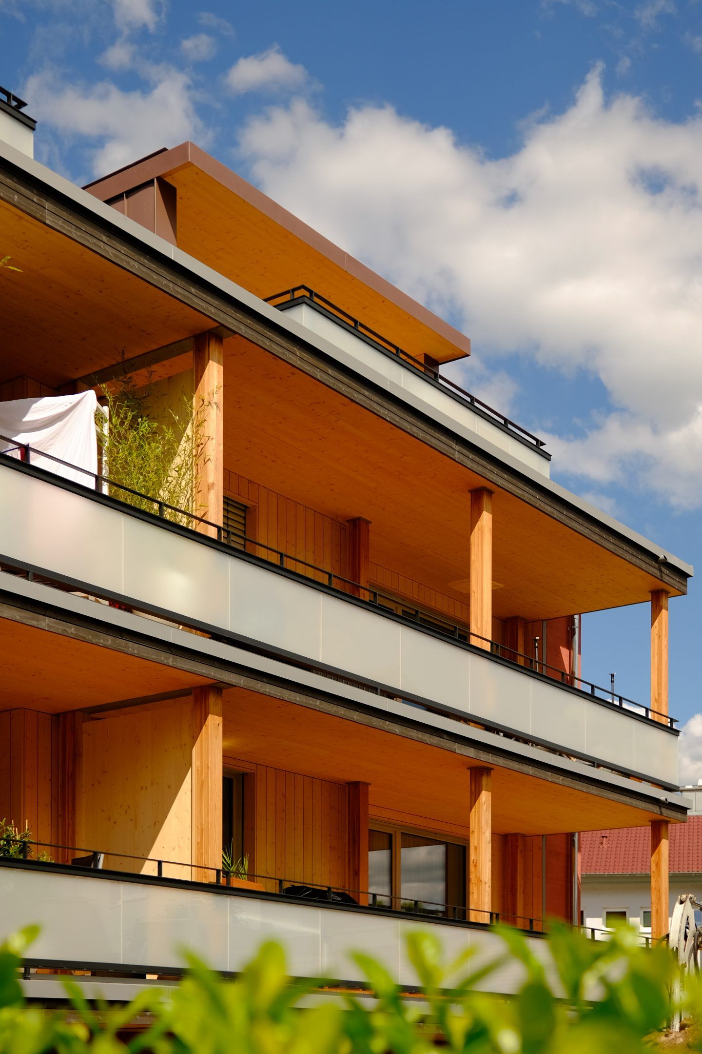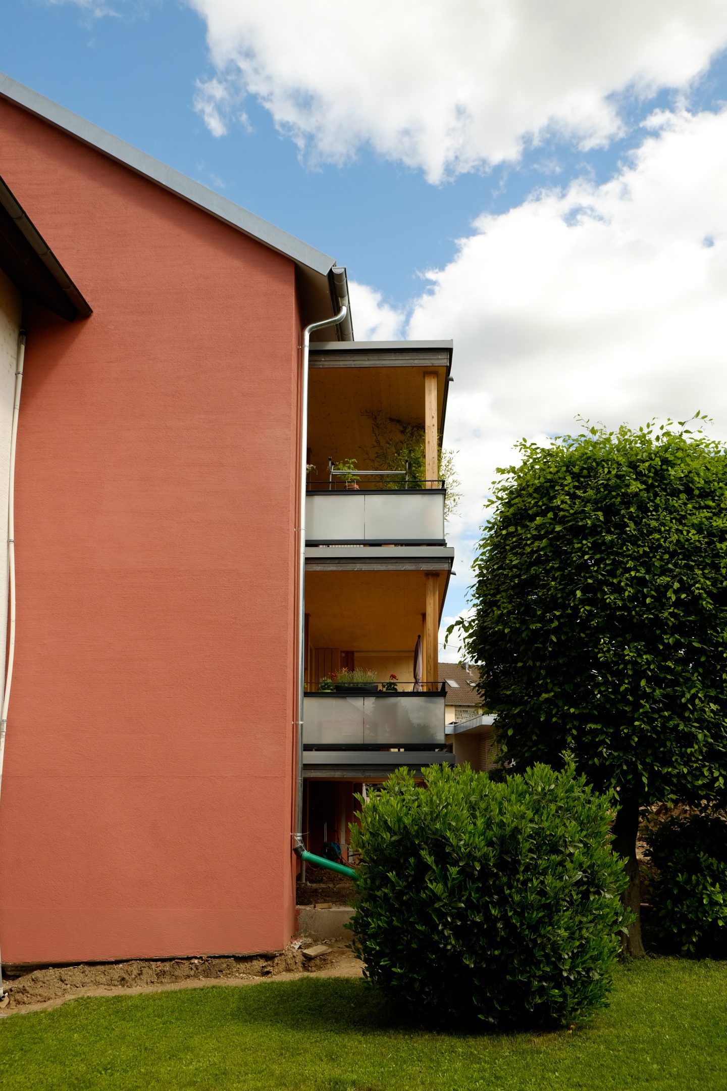 Als energetische Maßnahmen dienen die Abtrennung der bestehenden Betonbalkone auf der Süd- und Ostseite, die Dämmung der Fassade /Außenwand gegen Erdreich sowie ein neuer Dachstuhl mit jeweils zwei Gauben nach Süden und Norden. Die neuen Balkone in Holzkonstruktion werden vor die Süd- und Ostfassade gesetzt und an der Fassade rückverankert. Die Südbalkone erstrecken sich über alle Geschosse, die Ostbalkone im Erdgeschoss und Obergeschoss.