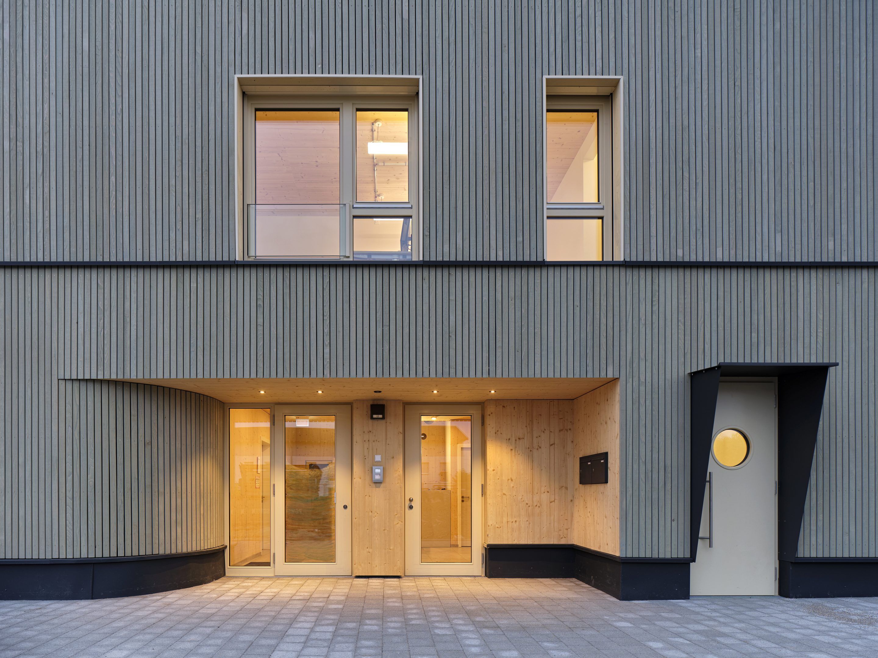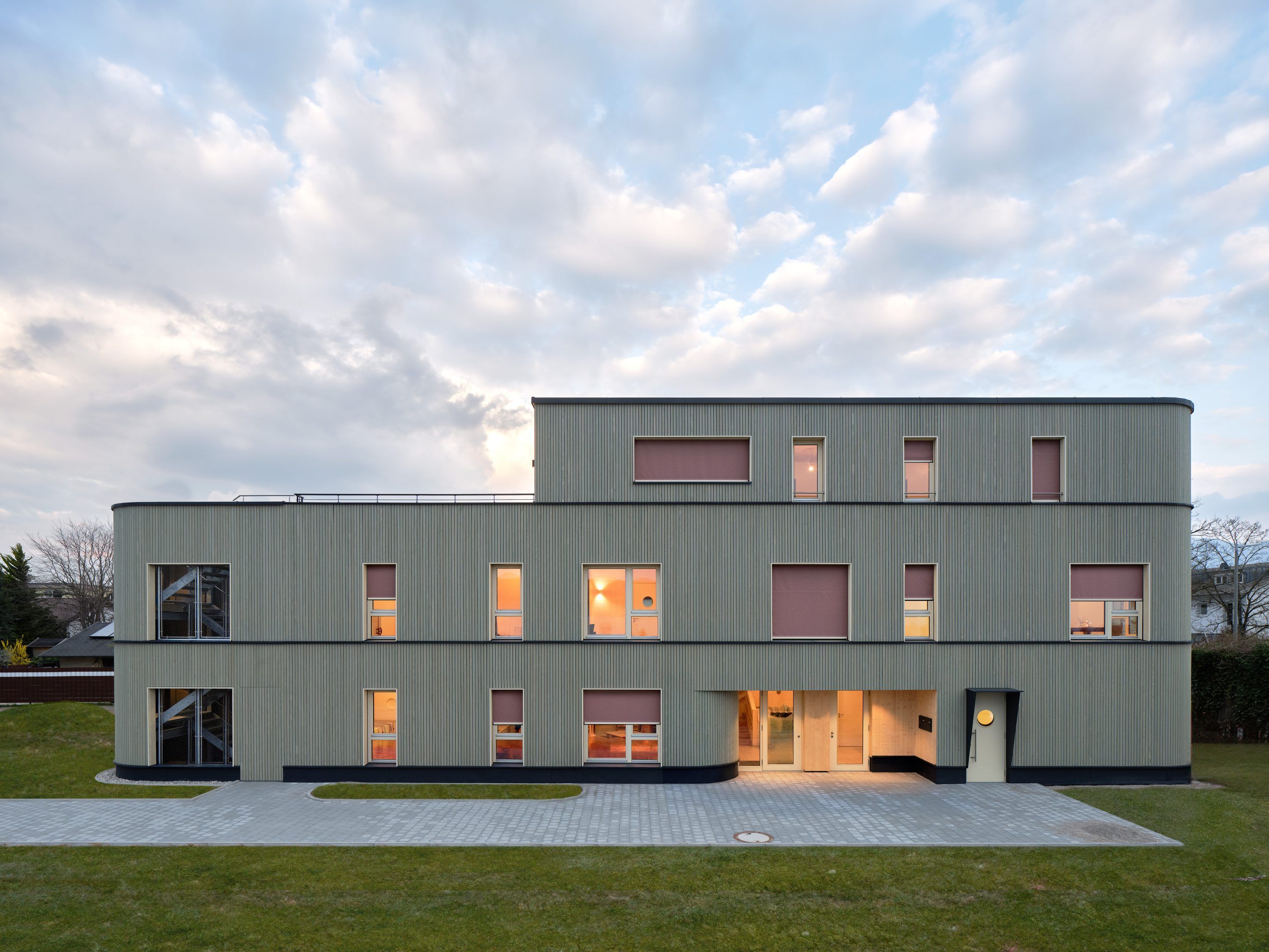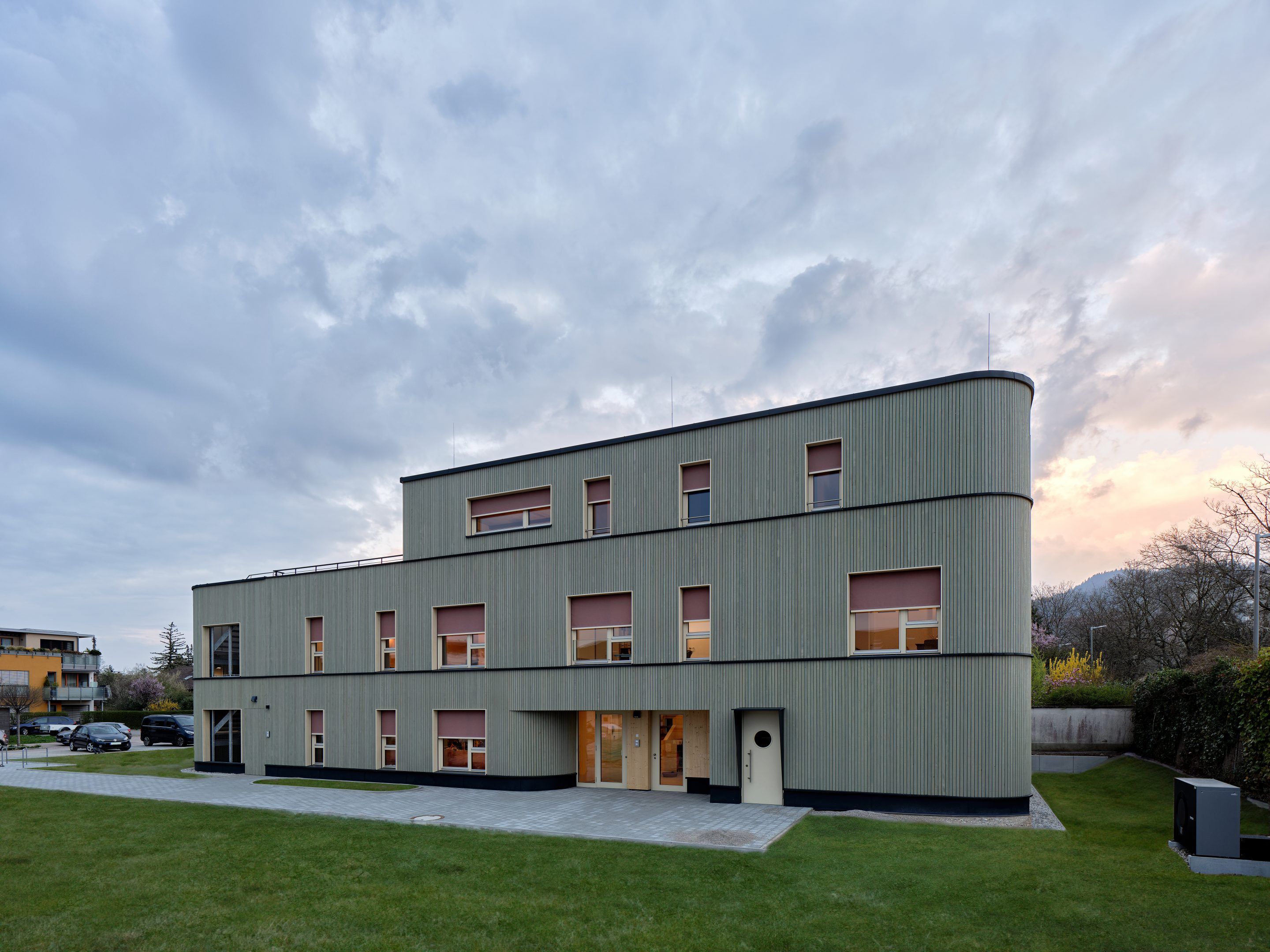 In Staufen im Breisgau schafft der zweigeschossige Neubau eines Kindergartens neue Räumlichkeiten für den Waldorfverein Staufen. Darüber hinaus findet das Gebäude durch eine Wohnnutzung im Attikageschoss eine Antwort auf Verdichtungsmöglichkeiten im Stadtraum. Das Gebäude überzeugt durch seine besondere Form, den gerundeten Ecken und dem Farbspiel der Fassadenelemente. Das Gebäude ist als Holzständerbau, mit tragenden Innenwänden und Decken in Holzmassivbauweise ausgeführt.