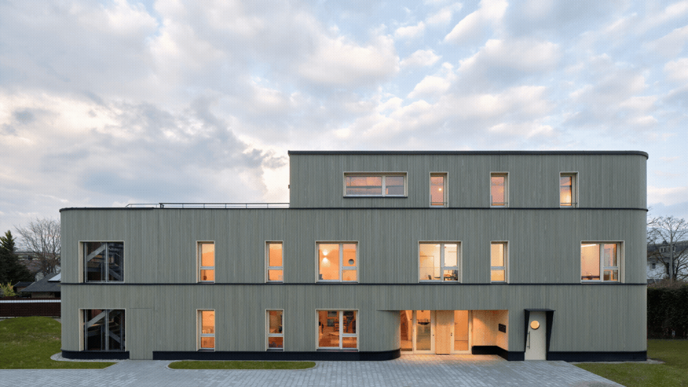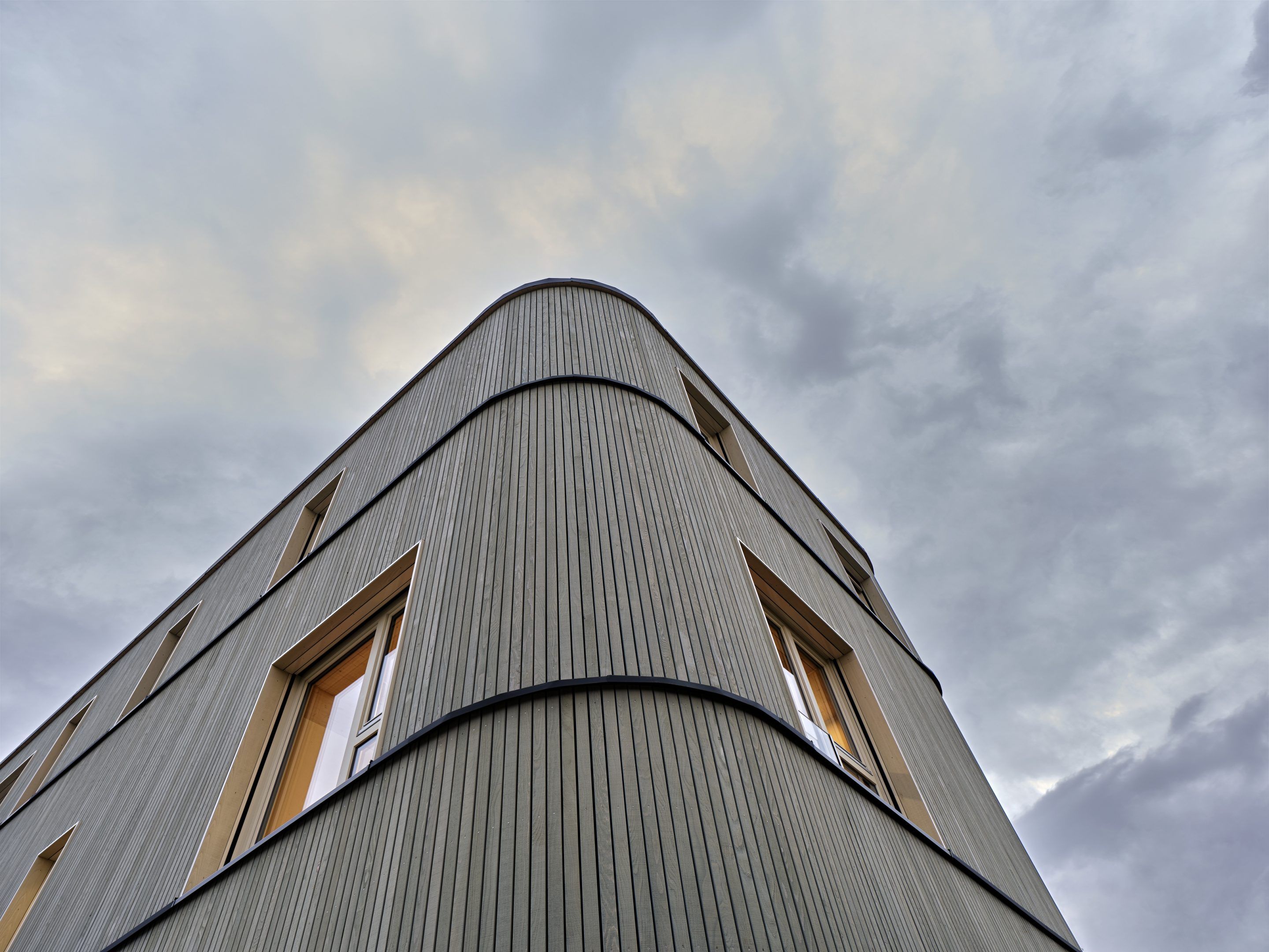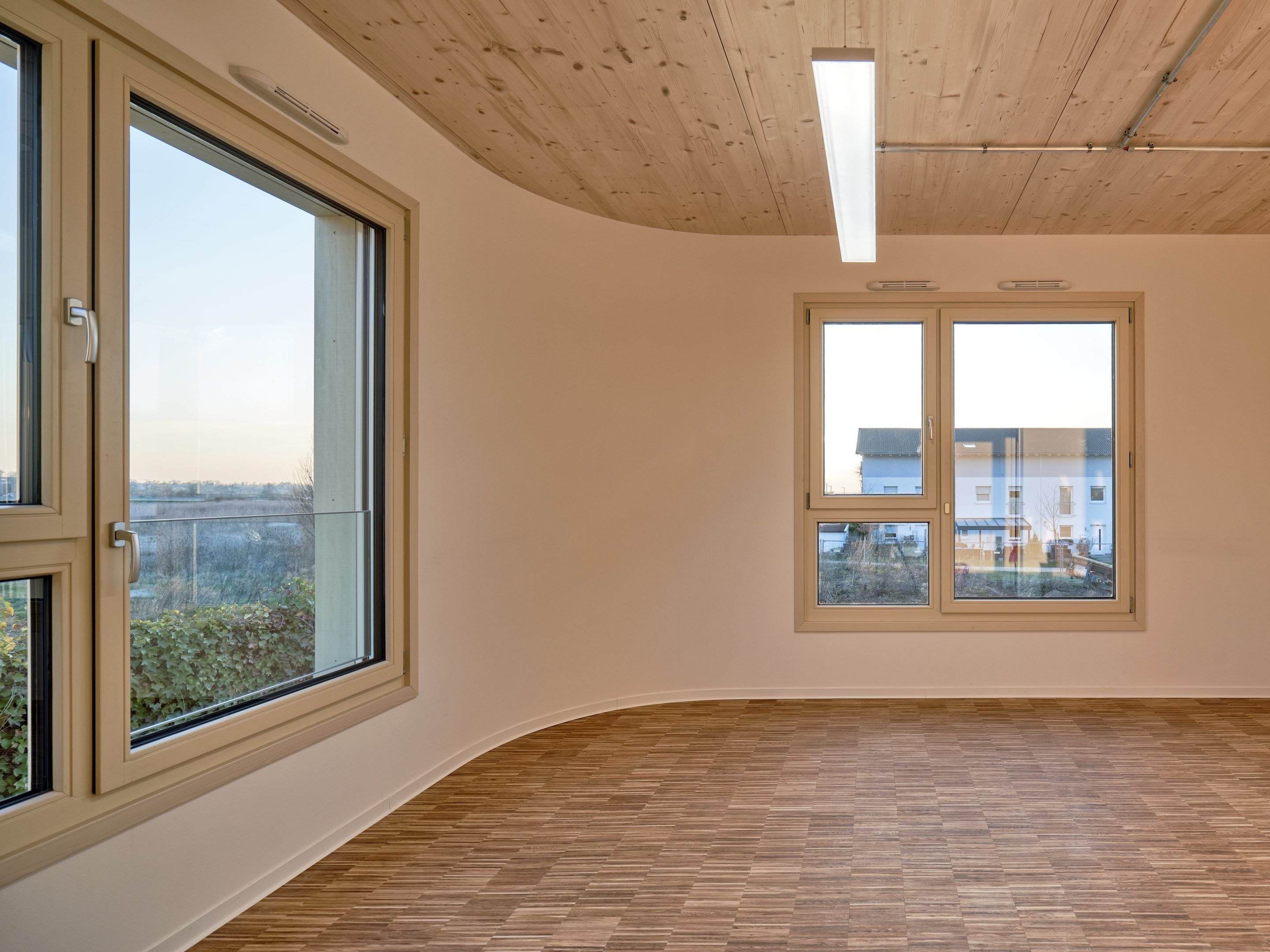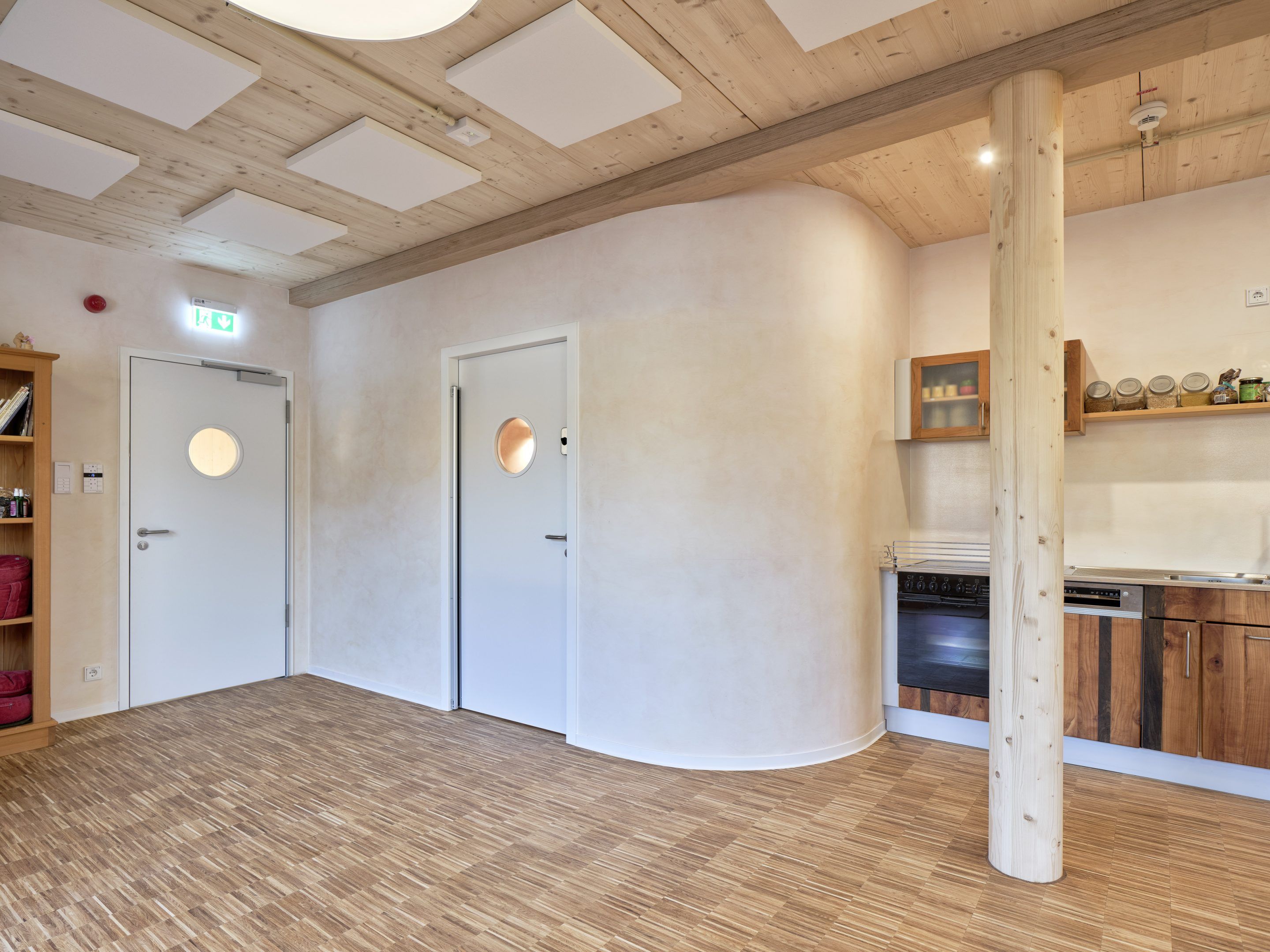 In Staufen im Breisgau schafft der zweigeschossige Neubau eines Kindergartens neue Räumlichkeiten für den Waldorfverein Staufen. Darüber hinaus findet das Gebäude durch eine Wohnnutzung im Attikageschoss eine Antwort auf Verdichtungsmöglichkeiten im Stadtraum. Das Gebäude überzeugt durch seine besondere Form, den gerundeten Ecken und dem Farbspiel der Fassadenelemente. Das Gebäude ist als Holzständerbau, mit tragenden Innenwänden und Decken in Holzmassivbauweise ausgeführt.