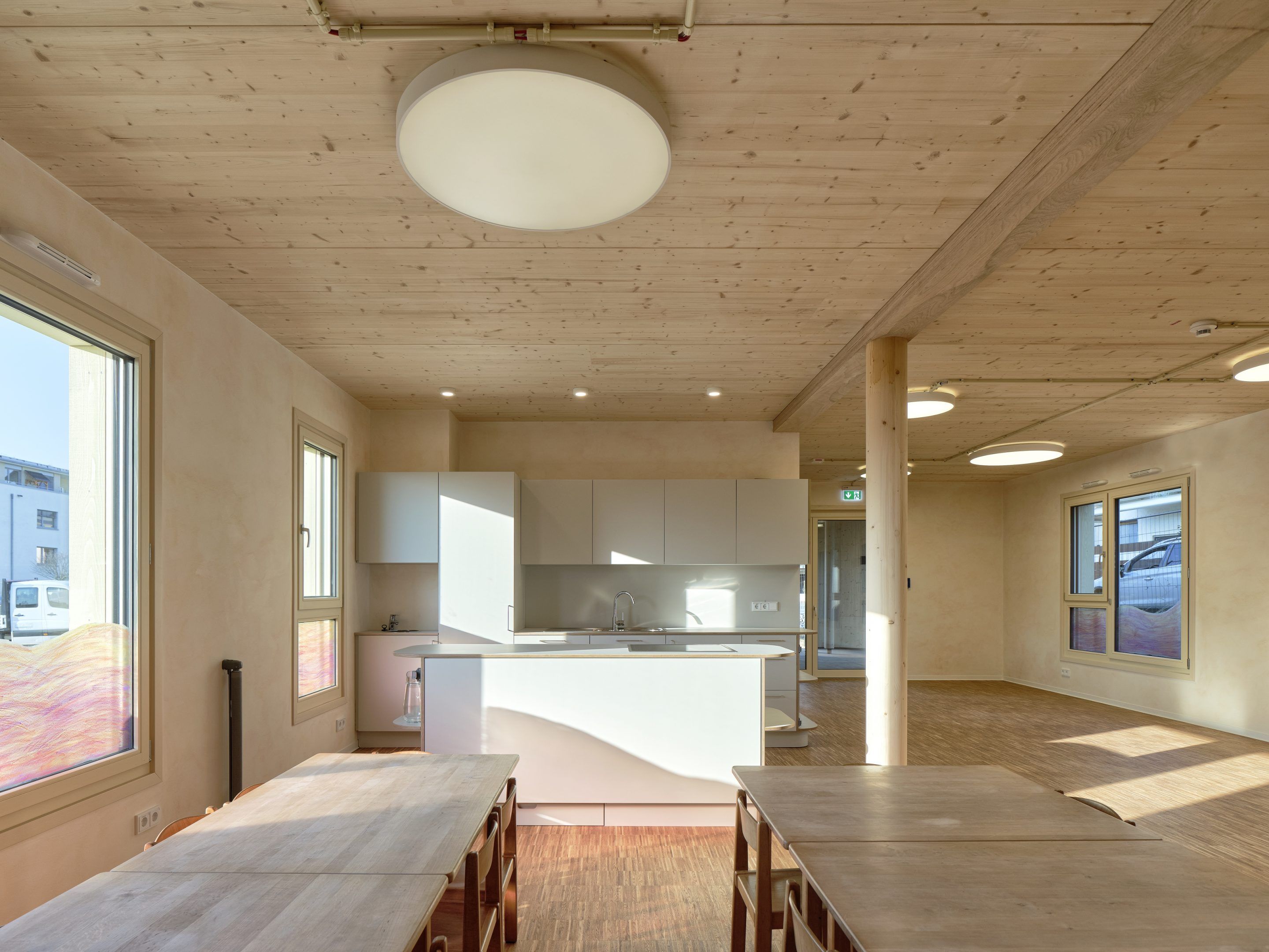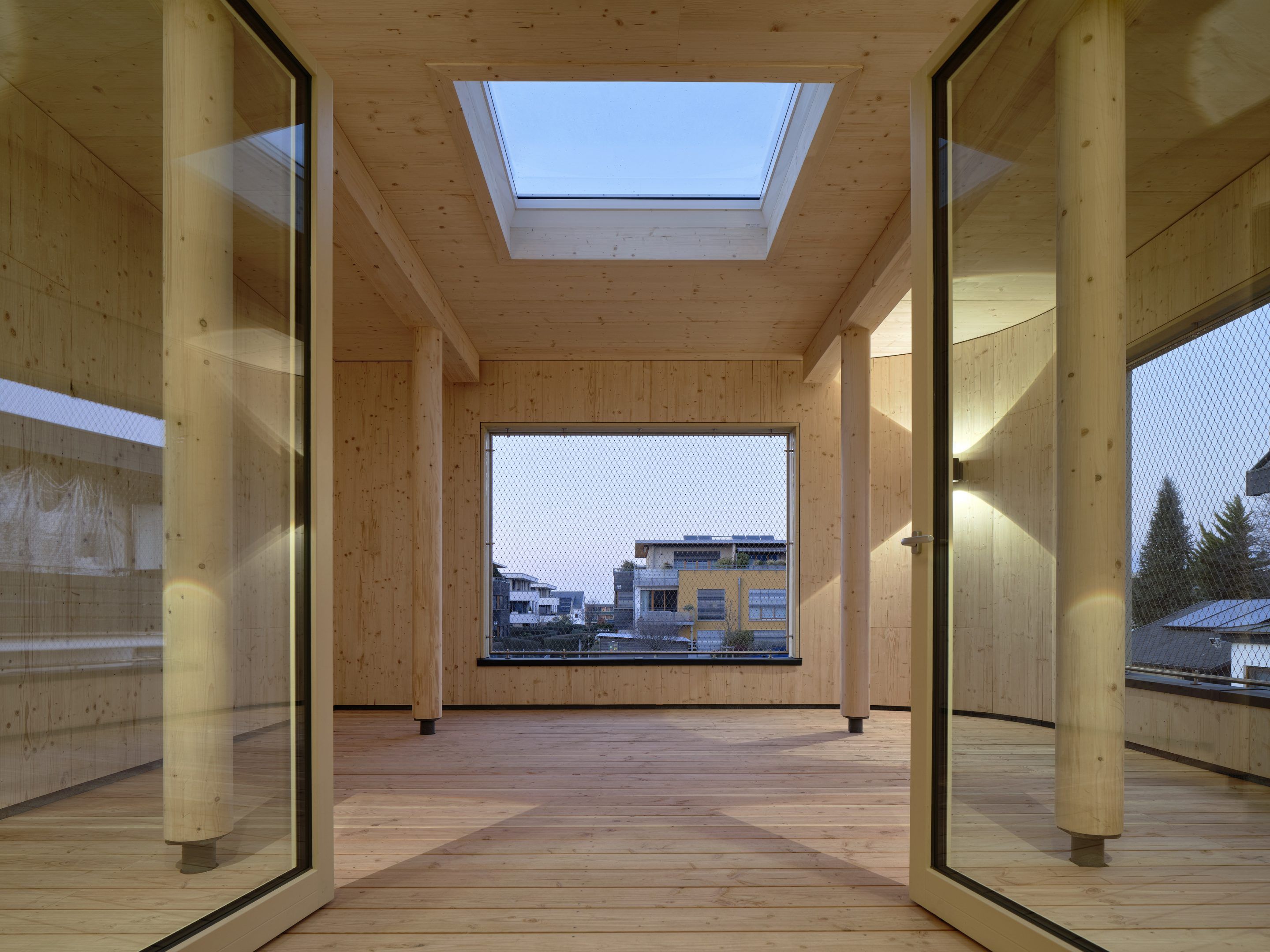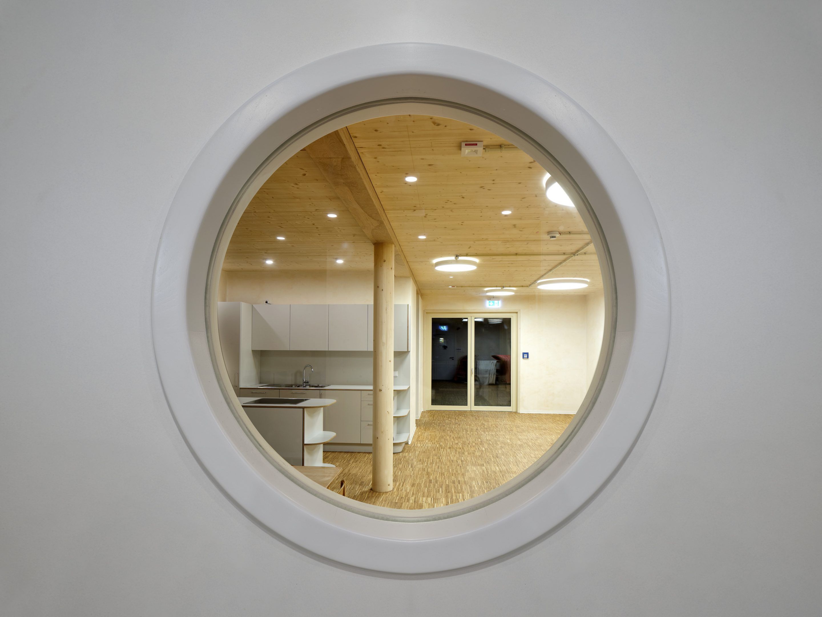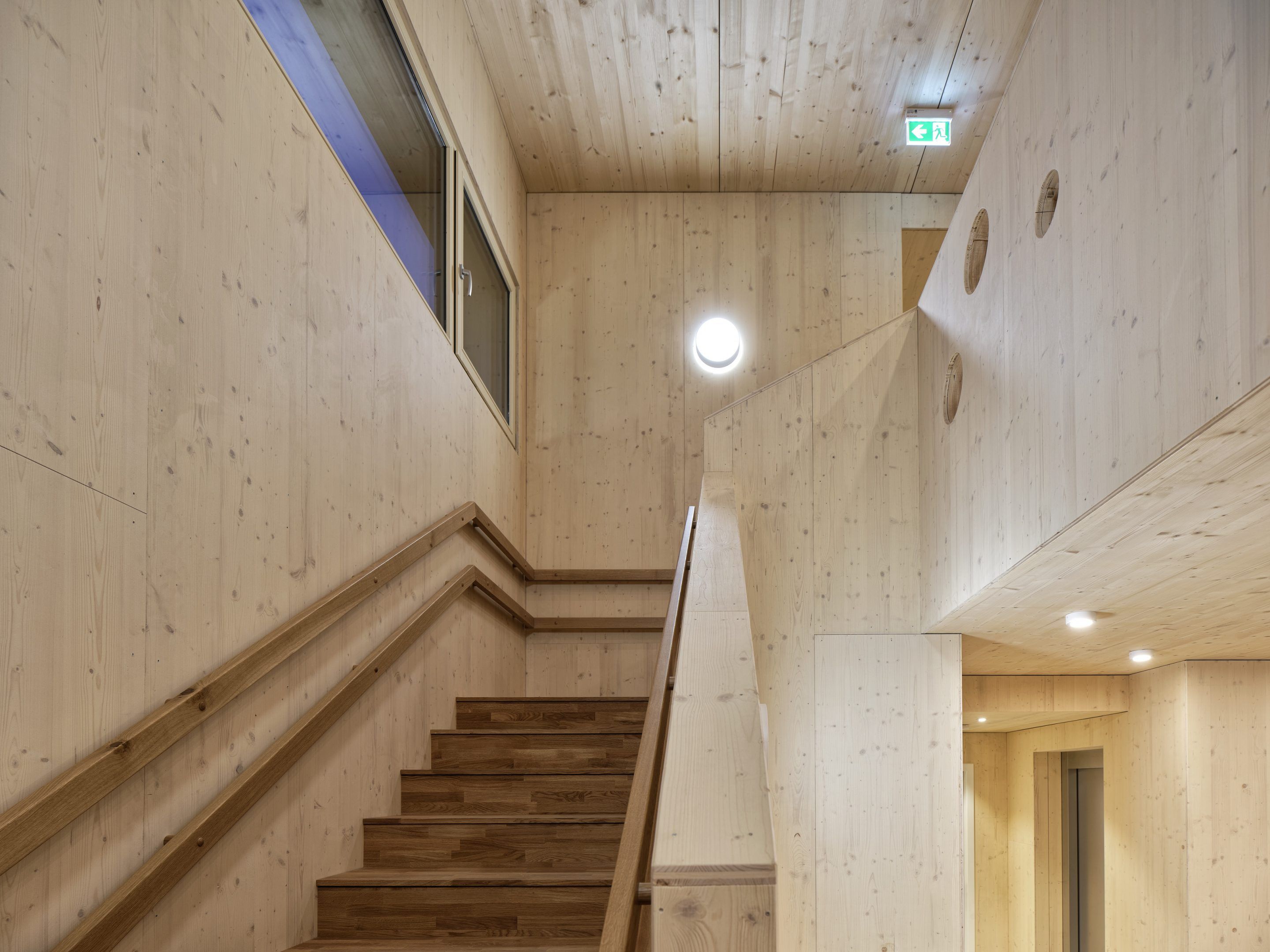 Der zweigruppige Kindergarten verfügt im Erd- und Obergeschoss über eine überdachte Terassenzone. Große Fenster mit kindgerechten Brüstungshöhen sorgen für lichtdurchflutete Räume. Das Foyer mit offenem Treppenraum und Galerie bildet das Zentrum der Nutzungseinheit. Die Ausschnitte in der Treppen- und der Galeriebrüstung ermöglichen Durchblicke für die Kinder und schaffen eine visuelle Verbindung der beiden Ebenen. Die Wohnung im Attikageschoss ist barrierefrei über den Aufzug zugänglich und bietet auf der großzügigen Dachterrasse einen Ausblick auf die Burg.