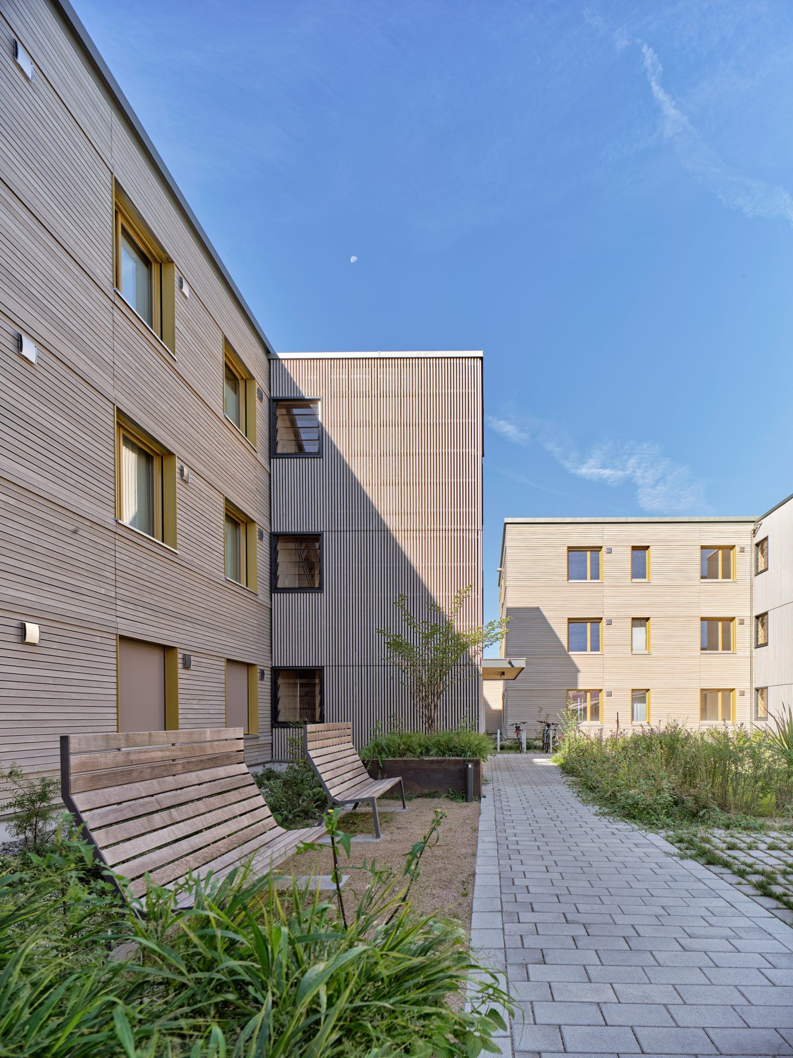 Die vier Wohngebäude werden in ökologischer, serieller Holzmassivbauweise errichtet. Dabei wird der KFW Effizienzhaus 40 Plus-Standard erreicht. Durch konsequente Nutzung des klimapositiven Baustoffes Holzes und einem innovativen Energiekonzept einschließend eines Mieterstrommodells, konnte in Zusammenarbeit mit Stahl+Weiß PartGmbB eine CO2-Bilanzierung vorgenommen werden, die den richtungsweißenden Charakter des Gebäudes belegt: Nach vier Jahren Nutzung ist die CO2-Bilanz durch die Produktion an regenerativer Energie ausgeglichen, nach neun Jahren Nutzung ist der Betrieb CO2-neutral und die Wohnanlage produziert mehr Energie als sie in Erstellung und Betrieb benötigt.