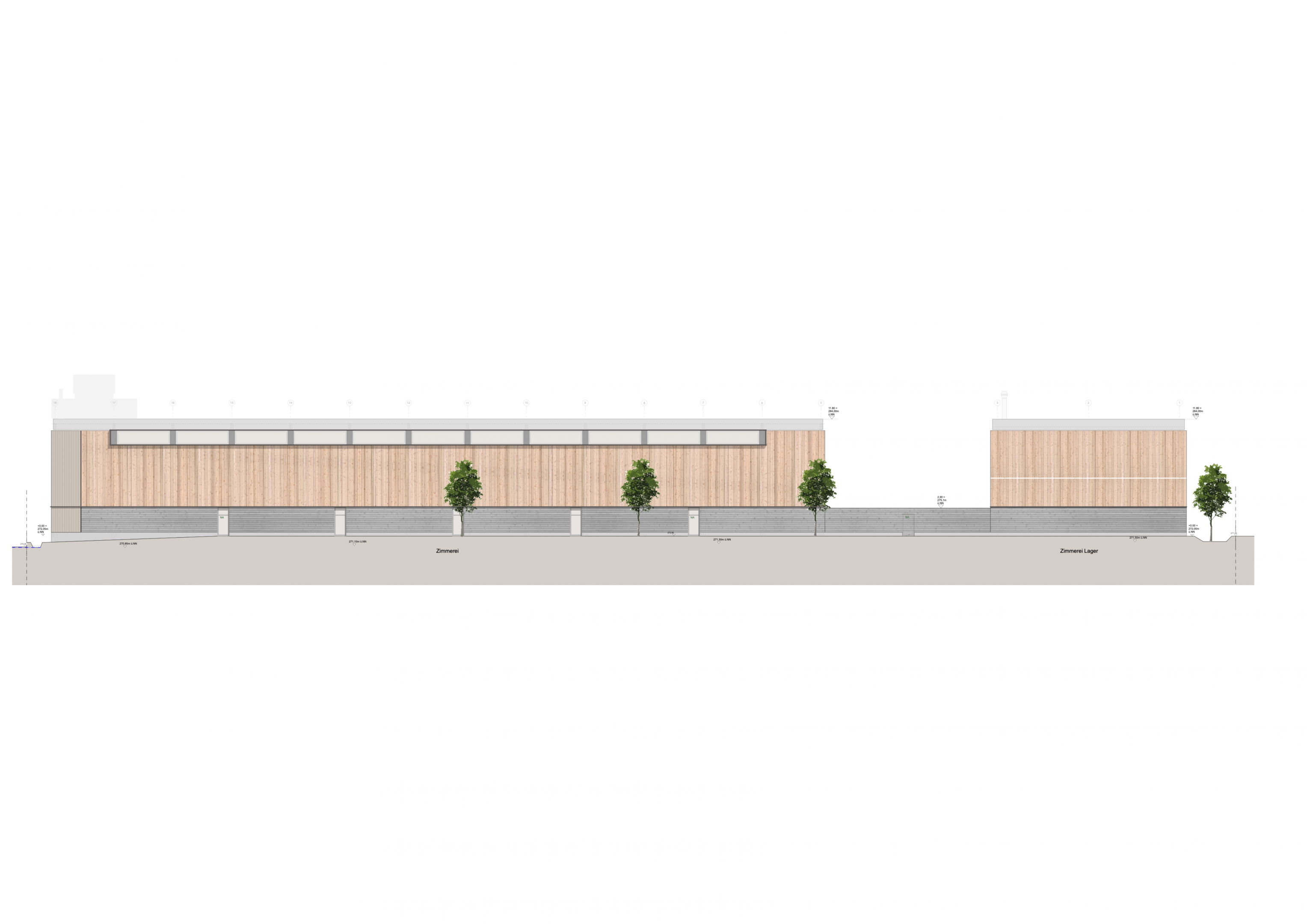 Die Setzung der Baukörper folgt konsequent den funktionalen Anforderungen der Produktionsabläufe und den logistischen Erfordernissen des Außenraums. Durch kurze interne Wege und eine präzise Zuordnung der Nutzungen entstehen effiziente Synergien zwischen Zimmerei und Schreinerei, die einen ressourcenschonenden und energieeffizienten Betrieb ermöglichen. Die L-förmige Anordnung der Baukörper strukturiert das Grundstück und definiert klar gefasste, funktionale Außenräume. Diese dienen als organisierte Verkehrs- und Andienungszonen und gewährleisten einen übersichtlichen, reibungslosen Betriebsablauf.